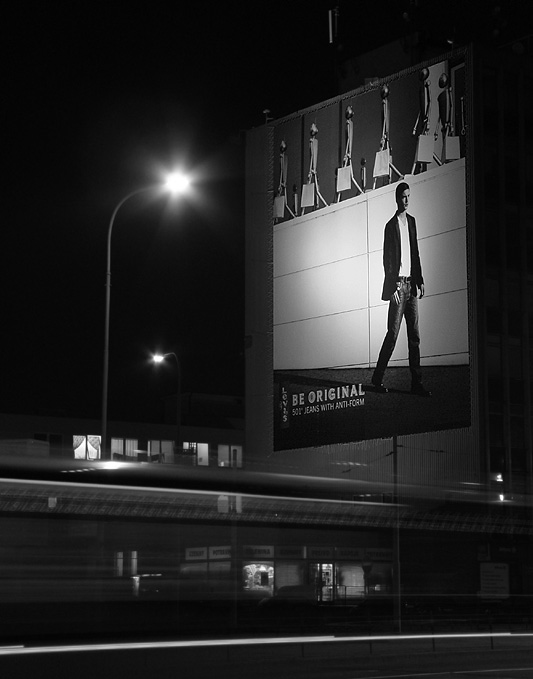 Dneska jsem vstával kolem půl páté ráno a vypravil jsem se do ulic lovit fotografie na téma „Reklama kolem nás“. Moje představa byla zachytit, trošku netradičně, nějaký dominantní reklamní motiv zasazený do našeho každodenního života. Fotil jsem hlavně na černobílý film, ale částečně taky i na digitál, z kterého dnes předkládám dvě fotografie.